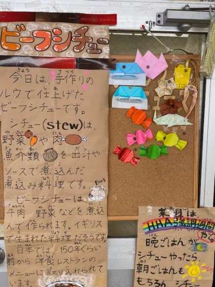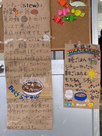 です。大きな給食室の釜で調理しているビーフシチューは、とても美味しいです。