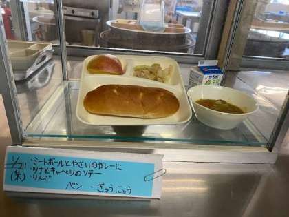 ミートボールと野菜のカレー煮、ツナとキャベツのソテー、りんご、おさつパン、牛乳