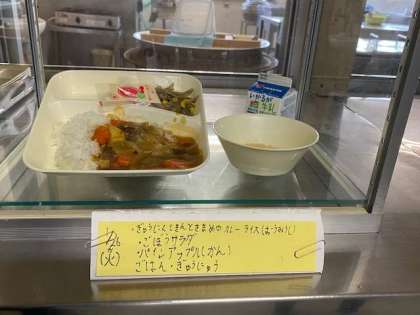 牛肉と金時豆のカレーライス、ごぼうサラダ、パインアップル、牛乳