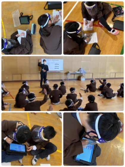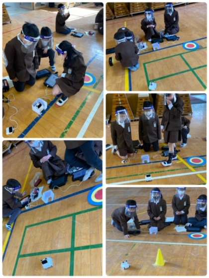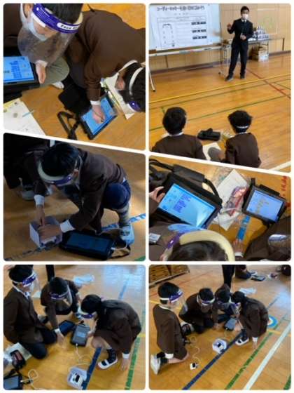 3時間目、校内ICT授業研究として、3年1組が講堂でプログラミング学習に取り組んでいました。今までの学習の延長として、スタートからコーンを回ってゴールに入るプログラミングを自分たちで考えて試していました。どうすればいいか、周りの友だちと相談しながら解決に向かって学習を進めることができていました。タブレットに命令を入力して、うまくロボットが動くと歓声があがっていました。