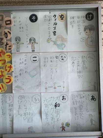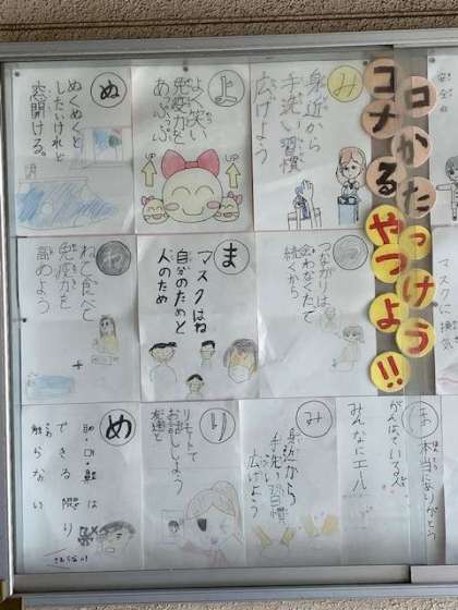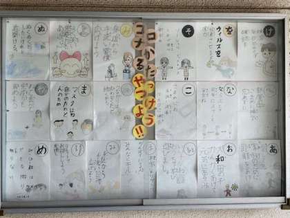 ?健康委員会の皆さんが、コロナをやっつけようというカルタを作りました。保健室の横の掲示板に掲示しています。