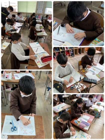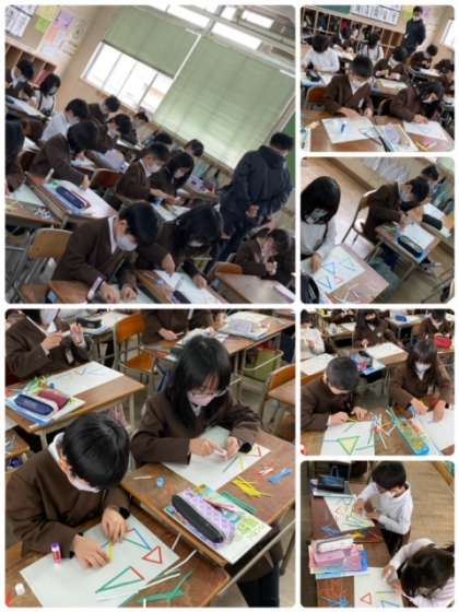 3年生は、算数の学習で、三角形について学んでいます。実際に自分たちでいろいろな三角形を作り、仲間分けをしたりして、特徴について考えています。