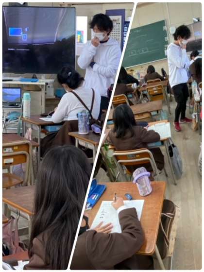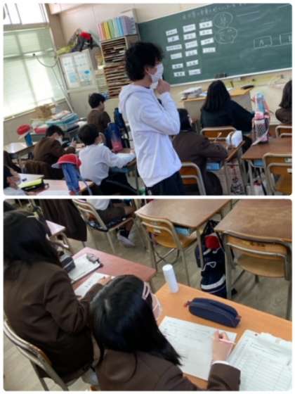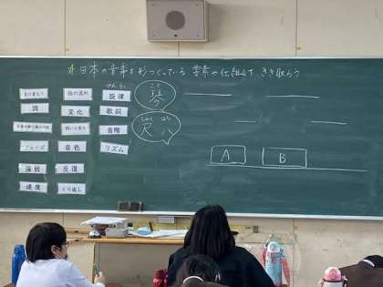?鑑賞の学習をしていました。曲をよく聴いて、曲の構造について気づくことができるように、ワークシートに書き出していました。琴と尺八で演奏されている日本ならではの曲をしっかり聴く観点を持って学習できていました。