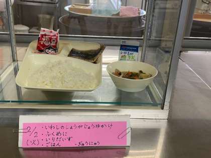 イワシの生姜醤油かけ、含め煮、いり大豆、ご飯、牛乳