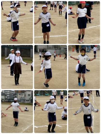 1時間目の後、まずは中学年がチャレンジです。3分間で合計何回跳べるかペアの子が回数を数えています。
