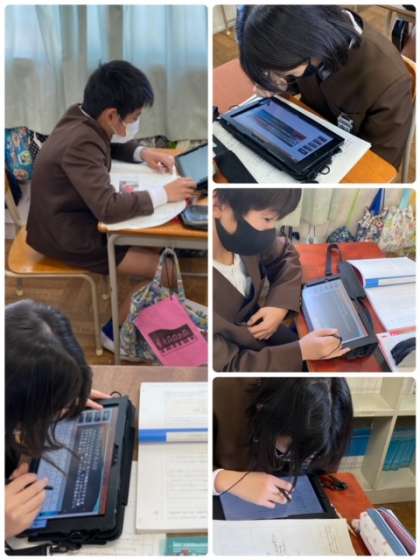 6年生が国語科の教材で、プロフェッショナルについて学習し、自分たちの考えを、資料を参考にしながら、上手にタブレットを活用し、発表原稿を作っています。先生が一人一人の進捗状況を確かめながら、助言されていました。出来上がりが楽しみです。国語科の学習でありながら、キャリア教育でもあります。