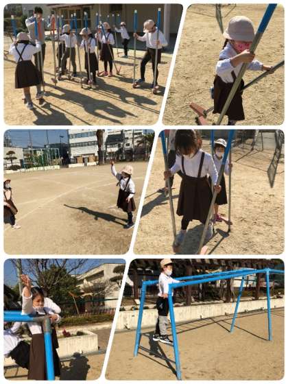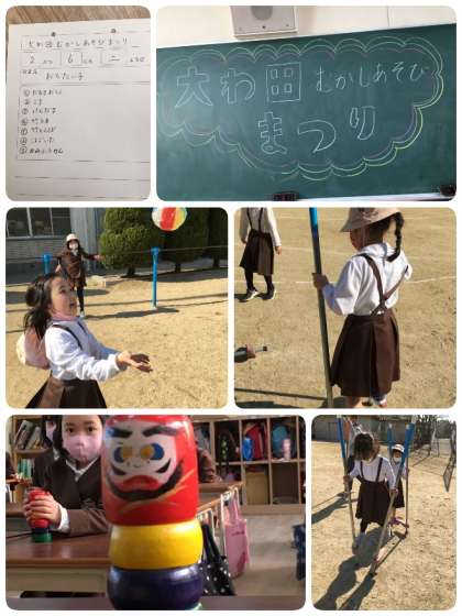 1年生は、校長先生に教えてもらったけん玉や、こま回しだけでなく、たくさんのむかしあそびを体験しました。