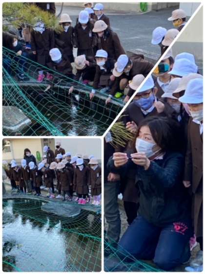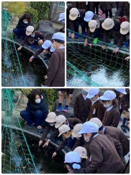 1年生が、朝その様子を見にきました。落ちないように気をつけながら、実際に氷に触ってもみました。
