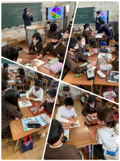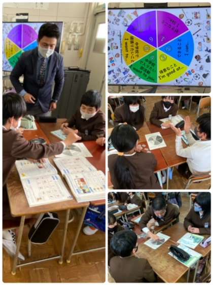 6時間目、6年生と学習している様子です。ペンと紙を上手に活用してルーレットにし、出たお題に基づき発表し、ポイントを獲得していくというゲーム形式でした。どの班も意欲的に発表できていました。