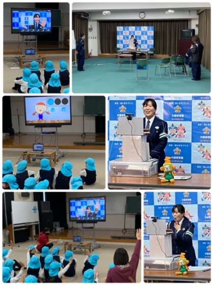 大和田幼稚園の年長さんが大和田小学校に、姫島幼稚園の年長さんが姫島小学校に、野里幼稚園の年長さんが歌島小学校に行き、Teamsで一斉に指導を受けました。発信元として大和田小学校から行いました。