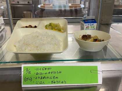 肉じゃが、白菜の柚子風味、とら豆の煮物、ご飯、牛乳