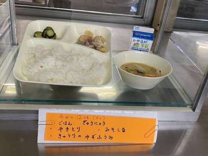 焼き鳥、味噌汁、きゅうりのゆず風味、ご飯、牛乳