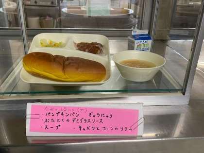 豚肉のデミグラスソース、スープ、キャベツとコーンのソテー、パンプキンパン、牛乳