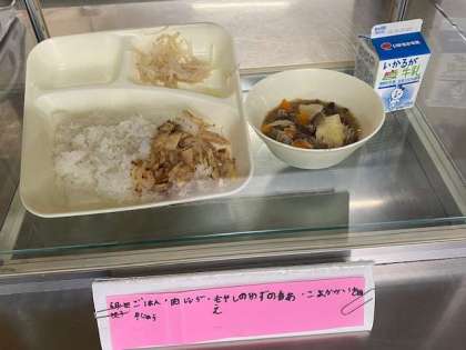 肉じゃが、モヤシの柚子の香和え、ゴマカカ炒め、ご飯、牛乳