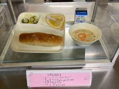 コーンクリームシチュー、キャベツときゅうりのサラダ、河内晩柑、パン、牛乳