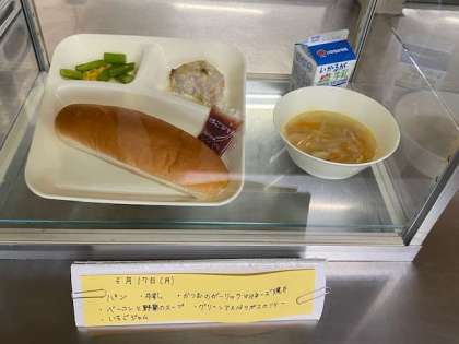 カツオのガーリックマヨネーズ焼き、ベーコンと野菜のスープ、グリーンアスパラガスのソテー、コッペパン、いちごジャム、牛乳