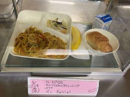カレースパゲッティ、キャベツのひじきドレッシング、バナナ、黒糖パン、牛乳