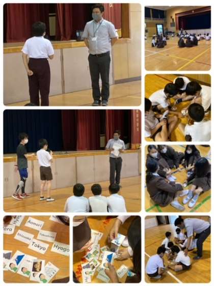 6年生が、日本の観光地や食文化を外国の方に伝える授業をしていました。都道府県名と観光地などの写真を選んで伝える練習をグループごとにしていました。