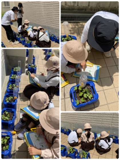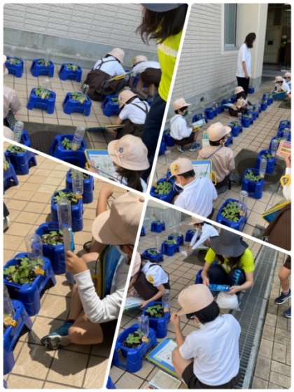 この前種まきをしたアサガオが、芽が出て、すくすく成長しています。今日は天気が良かったので、1年生は観察記録をつけていました。葉っぱの様子、枚数などしっかり見ていました。