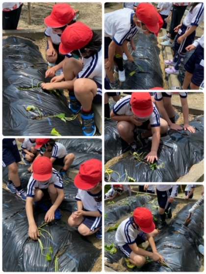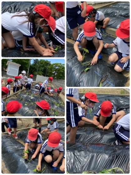 梅雨の合間の晴天。2年生が、学習園に、サツマイモの苗を植える活動をしていました。