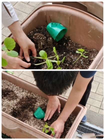 今日、中庭のプランターに本葉が出てきたヒョウタンの苗を植え替えました。