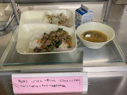 豚ひき肉とニラのそぼろ丼、味噌汁、キャベツの赤紫蘇和え、牛乳
