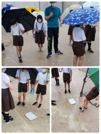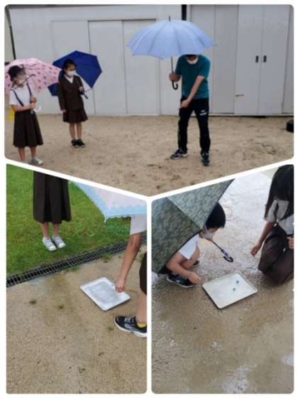 まずは、雨の行方です。降ってきた水はどこへ、どう流れていくのでしょうか。雨天の今日、砂場と校庭の水はけの違いを観察したり、流れのあるところではビー玉を転がして地面の高低差を調べたりしました。