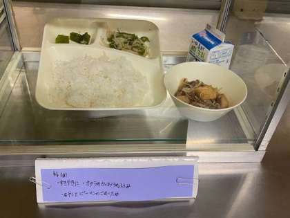 すき焼き煮、オクラのカツオ梅風味、もやしとピーマンの胡麻炒め、ご飯、牛乳