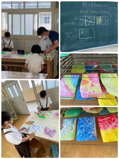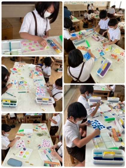 1組が絵の具で夢模様という題材で、学習をしていました。2組は先行して取り組んだようです。