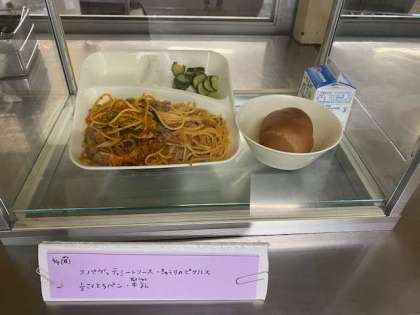 スパゲッティミートソース、きゅうりのピクルス、1/2黒糖パン、牛乳