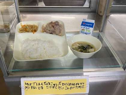 豚肉の甘辛焼き、すまし汁、切り干し大根の炒め煮、ご飯、牛乳