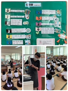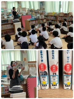 紙芝居の読み聞かせの後、本の背表紙に表示されている分類番号についてのお話になりました。「分類番号は、何種類ありますか?」のクイズにほとんどの4年生が10に手をあげることができました。