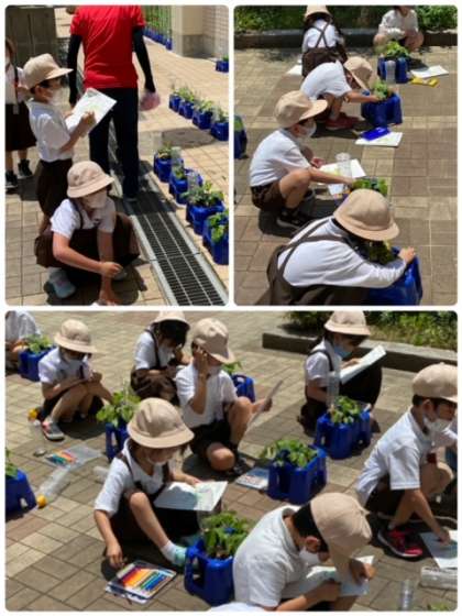 中庭で育てているアサガオの観察と、肥料の追加をしていました。すくすくと順調に育っています。