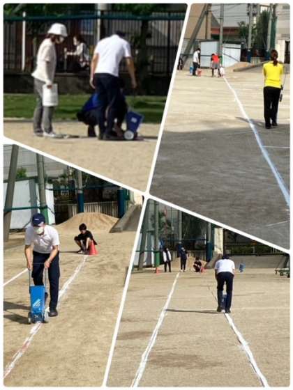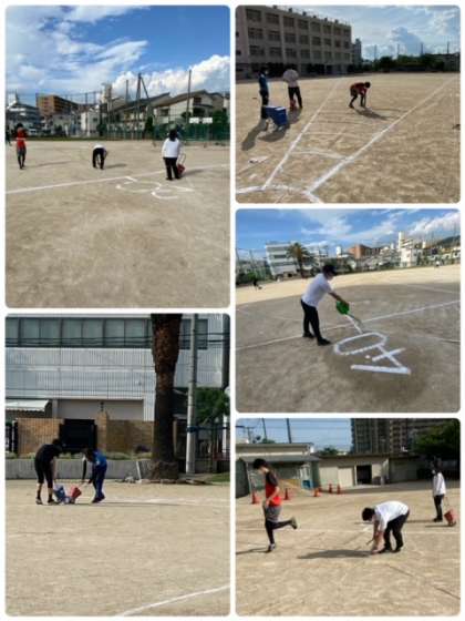 放課後、先生方で運動場に、ソフトボール投げと50メートル走のライン引きを行いました。