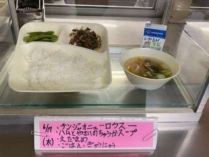 チンジャオニューロウスー、ハムと野菜の中華スープ、枝豆、ご飯、牛乳