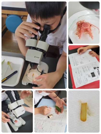 予想では植物の体のあちこちに水があると考えていた子どもたちです。植物の様々な部分を切り分け、通り道を見つけては「点々や!」、「端っこや!」と驚きの声をあげながら、学びを深めていました。