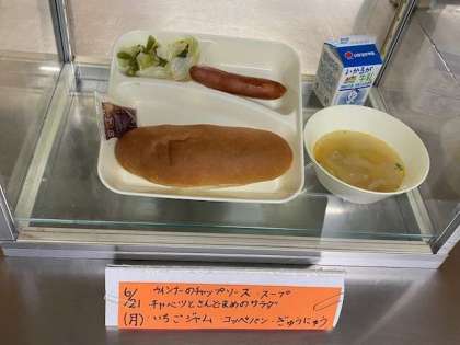 ウィンナーのケチャップソース、スープ、キャベツと三度豆のサラダ、いちごジャム、コッペパン、牛乳