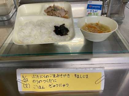 豚肉の胡麻味噌焼き、すまし汁、海苔の佃煮、ご飯、牛乳