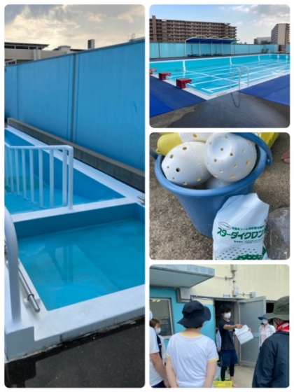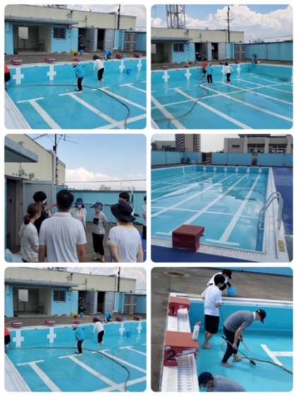 無事プール清掃が終わりました。最後にプールの水質検査の方法や塩素の入れ方、洗体槽の使い方などの説明を受けました。プール水泳をするには、さまざまな準備と配慮がなされます。