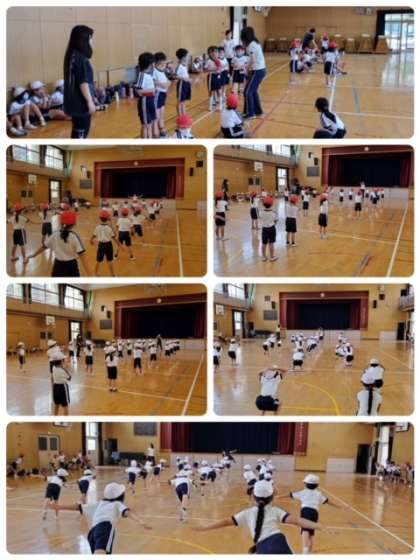 来週から小学校の大きなプール学習が始まります。1年生は、初めてのプールなので、教室からプールまでの移動や、お尻の洗い方、シャワーの仕方を練習しました。その後はプールに入ったつもりで、リズムに乗って体を動かしました。