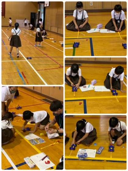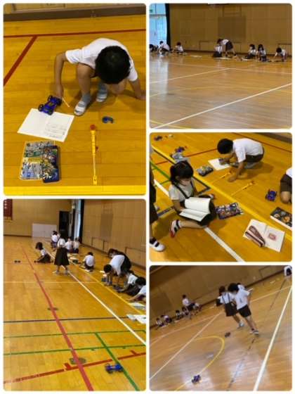 講堂で、ゴムの力で動く車を使って実験して、ゴムの長さや進んだ距離などを測定していきました。