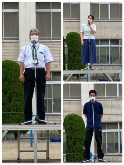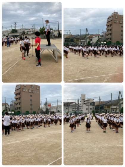 次に校長先生のお話です。「静岡で土石流が起きました。自然災害は、いつ起きるか分かりません。ここ大和田は、川に囲まれた地域です。そのため、千船には、川の流れを閉鎖する門があります。家族で避難について話しておきましょう。もう一つは、プールのお話です。プールでは、まずは水に慣れましょう。たくさん浮けるようになりましょう。背浮きの練習をしてください。」