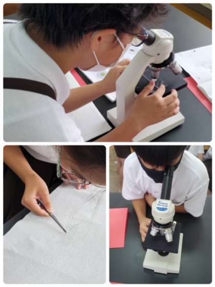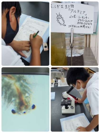 今日は、学習園の池や5年生が育てているメダカの水槽の水を顕微鏡で覗いて、小さな生き物の存在を観察しました。アオミドロやボルボックス、中にはミカヅキモが見えたり、サカマキガイの子どもが見えた班もありました。最後に、3年生の先生が育てている小さなエビの仲間「アルテミア」を顕微鏡で覗かせてもらいました。