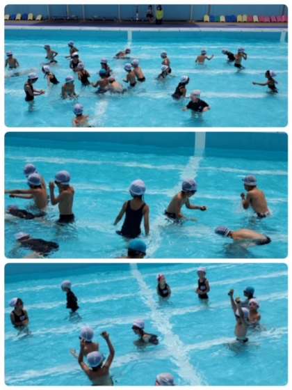今日はプール清掃日のために水を抜いて水位が下がっているため、1年生のプールは校長先生に指導いただいて、お楽しみメニューとなりました。