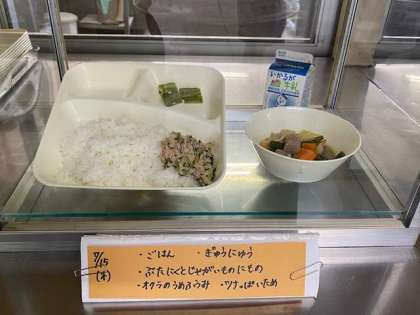 豚肉とジャガイモの煮物、オクラの梅風味、ツナっぱ炒め、ご飯、牛乳