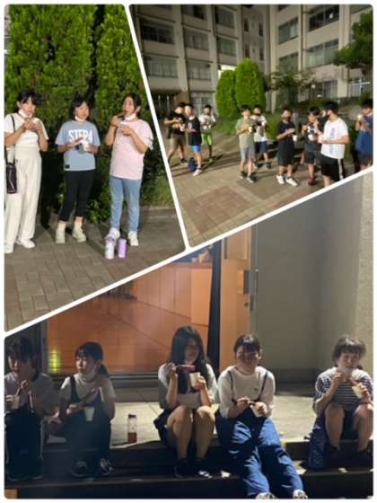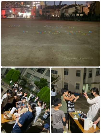 楽しんで少しお腹もすいたところで、少し夜食タイム。足元の灯りで使ったもので、運動場に文字を書いてみました。