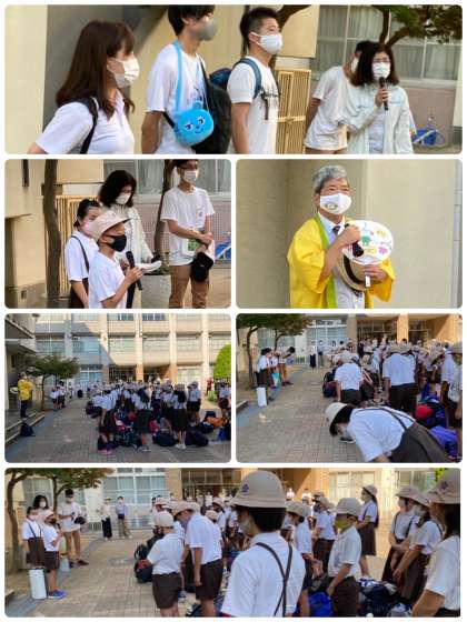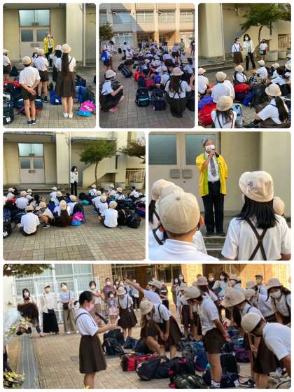 晴天のもと中庭に5年生が集合しました。今日から3日間の林間学習が始まります。出発式では児童の司会のもと校長先生のあいさつ、児童代表のあいさつ、付き添いの先生の紹介、担任の先生からの諸注意がありました。