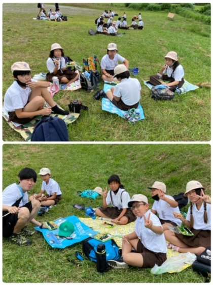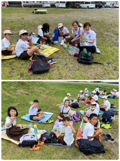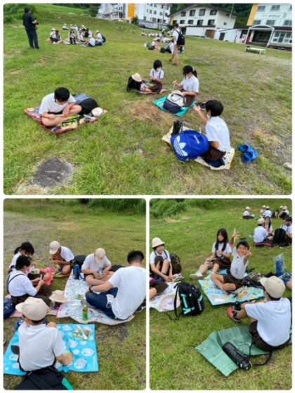 班ごとで、楽しく、涼しい風を受けながら、食べています。