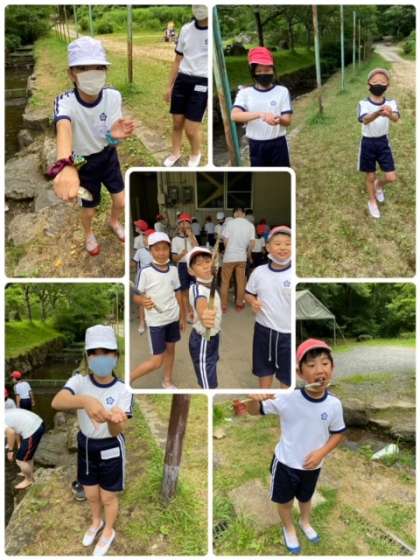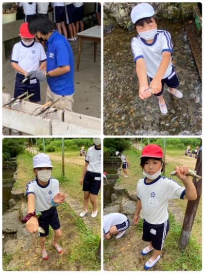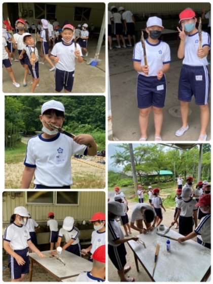 捕まえた魚は、自分で串にさして、炭火で焼いていただきます。