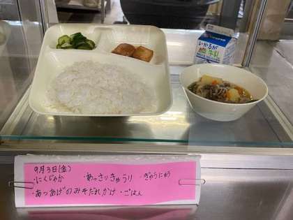 肉じゃが、あっさりきゅうり、厚揚げの味噌だれかけ、ご飯、牛乳